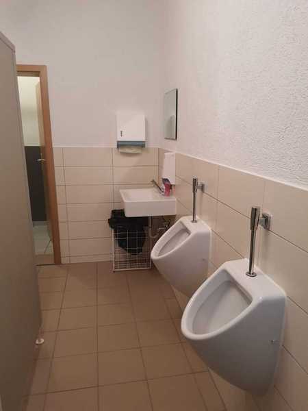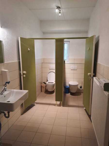 Es wurden die Ver- und Entsorgungsleitungen der Toilettenanlagen, die Sanitärkeramik, die Trennwände und die Fliesen komplett erneuert. Des Weiteren erfolgte eine aufwendige Sanierung der